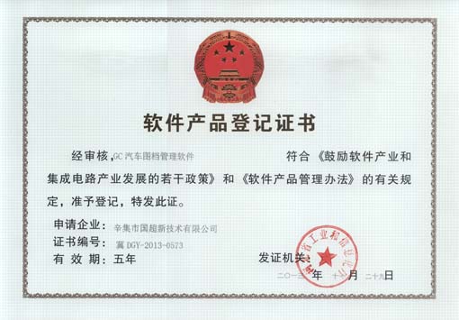 2013年11月29日,我公司研發(fā)的GC物流信息管理軟件、GC汽車圖檔管理軟件、GC汽車4S店客戶信息管理軟件順利通過河北省軟件評測中心評測,并獲得了河北省工業(yè)和信息化廳頒發(fā)的軟件產(chǎn)品登記證書。